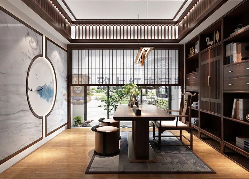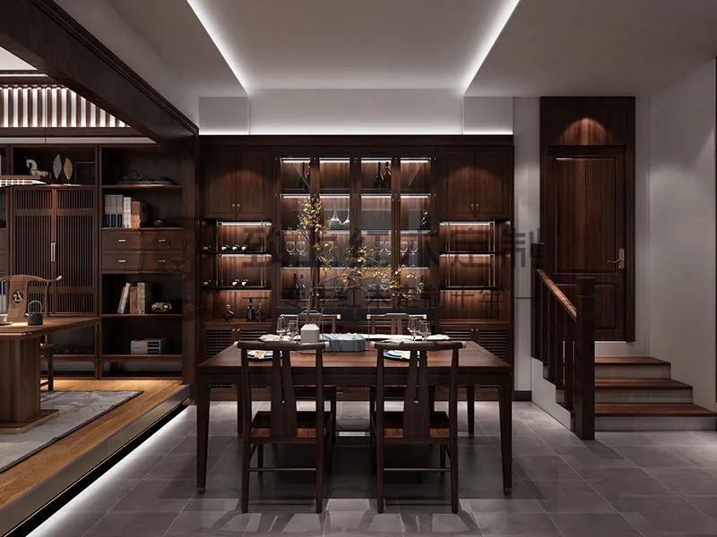 以現(xiàn)代中式風(fēng)格桌椅為主場(chǎng)景,以樣式獨(dú)特精致的通頂柜作為收納茶具茶葉、書籍藏品的所在,三五知己、親朋好友,在這里有悅目娛心的樂趣,也有寧?kù)o致遠(yuǎn)的格局。
