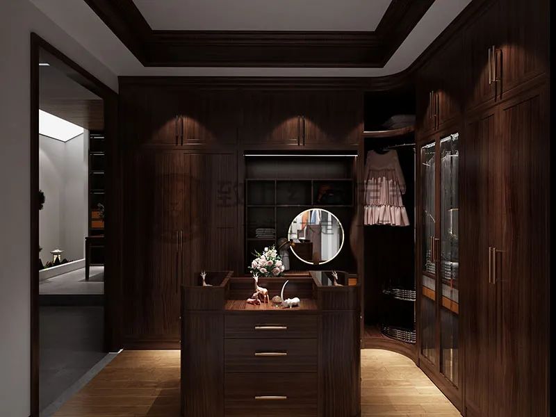 L型布局依墻面動(dòng)線而走,有效利用了空間。藏露相宜式組合設(shè)計(jì),滿足了收納與平時(shí)快速找尋衣物的需求。金色把手搭配實(shí)木材質(zhì),滿滿的精致感!
